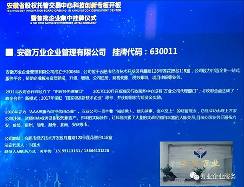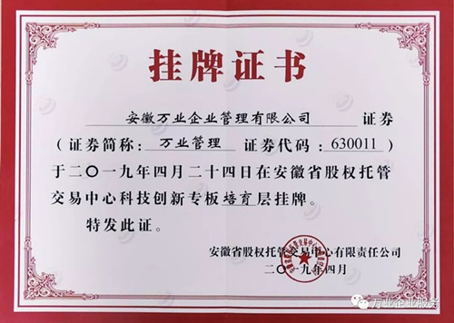 2019年4月24日這一天,安徽萬(wàn)業(yè)企業(yè)管理有限公司成功入駐安徽省股交中心首批科創(chuàng)板企業(yè),掛牌證券代碼:630011,這是值得被紀(jì)念的一天,是一個(gè)新的歷史上的里程碑!