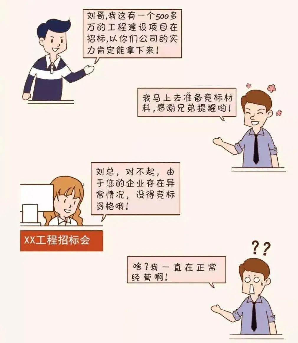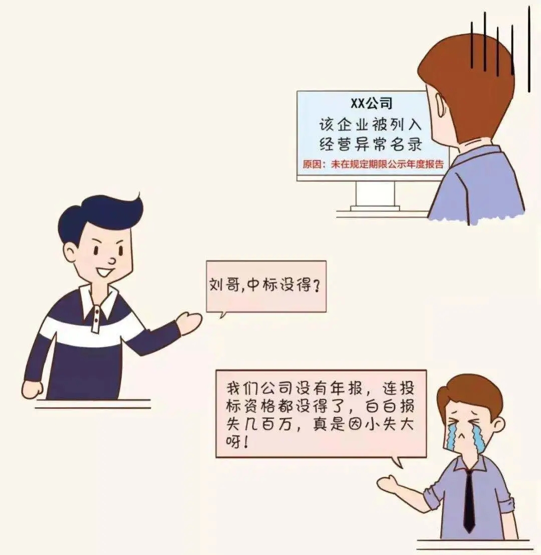 僅剩 7天 02企業(yè)合作信用受疑 現(xiàn)在是信用社會,信用對于人和企業(yè)來說都至關(guān)重要,大家都喜歡和有信用的人交往、合作。 被列入經(jīng)營異常名錄,你看看誰還找你合作! 03經(jīng)營活動受限 經(jīng)營異常名錄信息現(xiàn)在也是 銀行等金融機(jī)構(gòu)貸款、擔(dān)保等金融活動的 參考依據(jù) 老板 你好,我去年年報忘記報,現(xiàn)在被列入經(jīng)營異常名錄,本來想著在阿里巴巴注冊一個網(wǎng)店,在網(wǎng)上做點(diǎn)小生意,結(jié)果被告知因為企業(yè)是經(jīng)營異常名錄,注冊不了,這可怎么辦呀! 你好,首先應(yīng)在國家企業(yè)信用信息公示系統(tǒng)補(bǔ)報年報,然后再準(zhǔn)備好相關(guān)材料去當(dāng)?shù)厥袌霰O(jiān)管部門申請移出哦。 小編 老板 好的,萬萬沒想到?jīng)]報年報的后果竟然這么嚴(yán)重,嚴(yán)重影響了我的經(jīng)營活動,我真是后悔莫及。 是的,企業(yè)被列入經(jīng)營異常名錄,那就有了信用污點(diǎn),必須高度重視哦!對了,2019年度的年報馬上也要截止啦,請及時申報哦。 小編 老板 2019年度的年報我們公司馬上準(zhǔn)備申報了,經(jīng)過這次,以后一定不會忘了及時年報! 建議您盡早進(jìn)行年報,避免因月底網(wǎng)站擁堵或企業(yè)自身數(shù)據(jù)方面準(zhǔn)備不充分造成年報延遲。 小編 04列入嚴(yán)重違法企業(yè)名單 最最最嚴(yán)重的后果來啦! 列入經(jīng)營異常名錄三年還沒有履行信息公示義務(wù)的企業(yè),將被列入嚴(yán)重違法失信企業(yè)名單 企業(yè)五年內(nèi)不能申請移出嚴(yán)重違法失信名單,法定代表人、負(fù)責(zé)人也將受到牽連,三年內(nèi)不得擔(dān)任其他企業(yè)的法定代表人、負(fù)責(zé)人! 企業(yè)一站式服務(wù)平臺 工商注冊、財稅代賬、審計評估、稅務(wù)籌劃、商標(biāo)專利、資質(zhì)審批、人才獵頭、人才報名、金融保險、信用評級、法務(wù)咨詢、項目申報 公司網(wǎng)站:www.re-studio.com.cn 聯(lián)系方式:400-0551-976 合肥總部:安徽省合肥市南一環(huán)與馬鞍山路交口恒興廣場A座24樓 分部:合肥市行政服務(wù)中心一樓“萬業(yè)公司代理窗口”(工商局窗口正對面) 分部:合肥市瑤海區(qū)行政服務(wù)中心一樓“萬業(yè)公司代理窗口”(工商局窗口正對面)